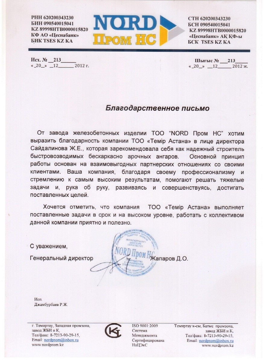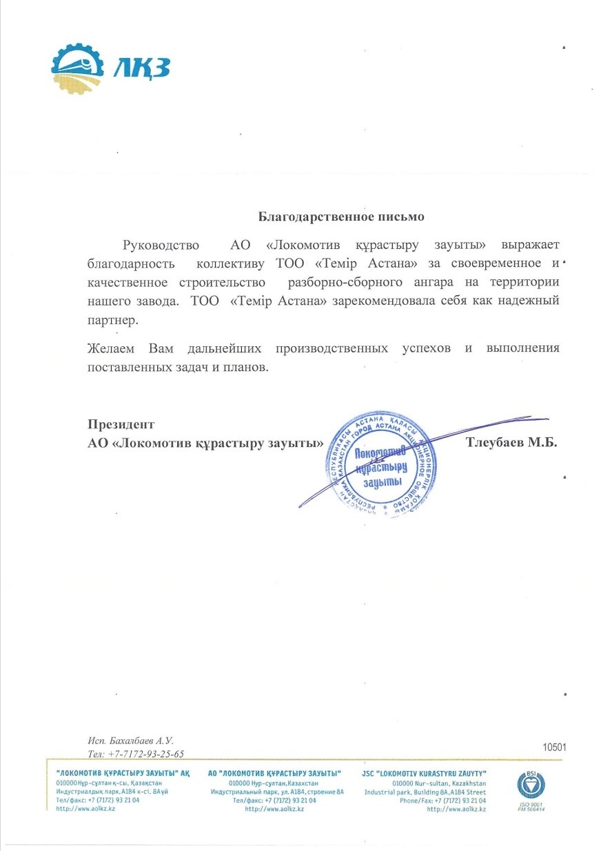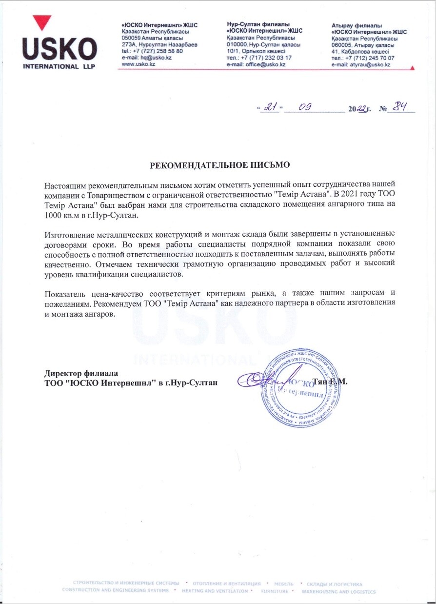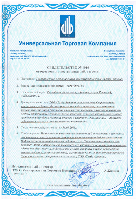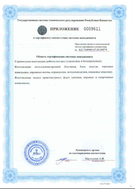 За период работы с 2010года на рынке металлоконструкций Казахстана наша Компания накопила опыт , который позволяет завершать строительство с опережением графика и без потери качества. Предоставляем гарантию.