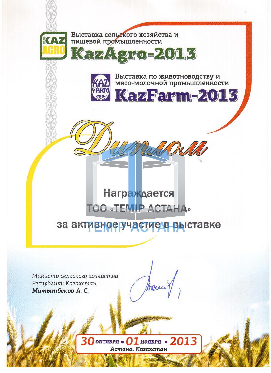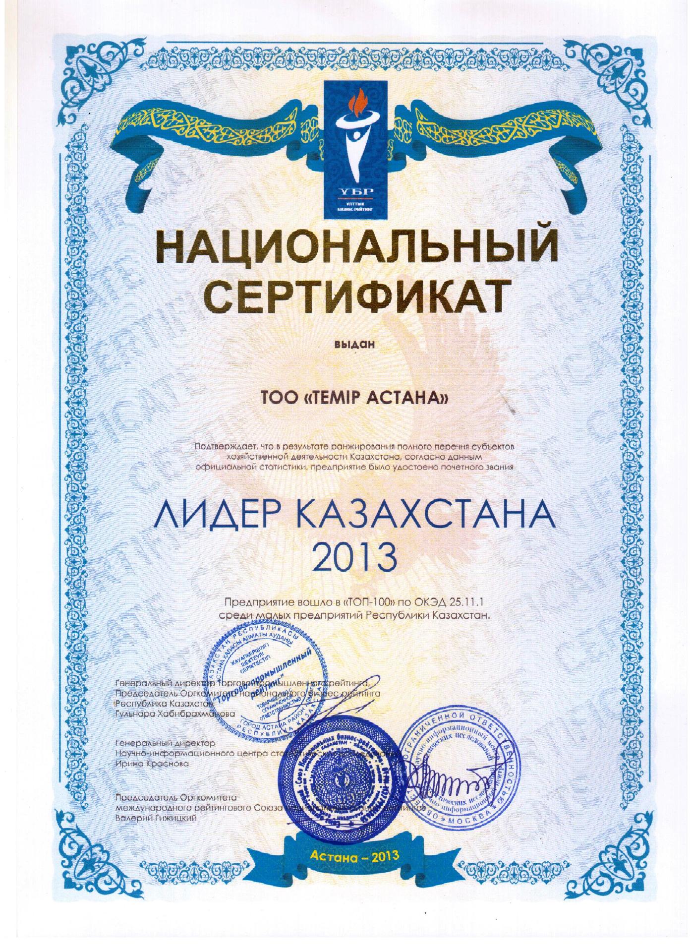 Наша компания удостоена почетного звания "Сала Қөсбасшысы 2013" на основании Национального бизнес рейтинга.